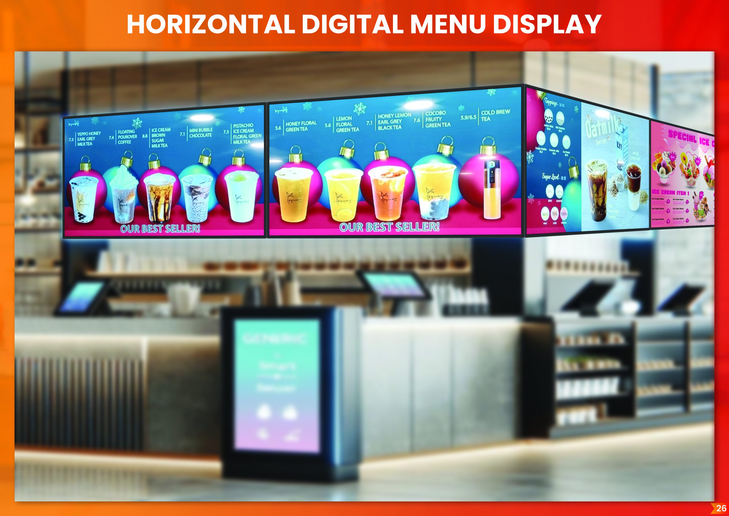 Display mouth-watering food photography, promotional videos, and auto-rotating advertisements alongside your live menu.